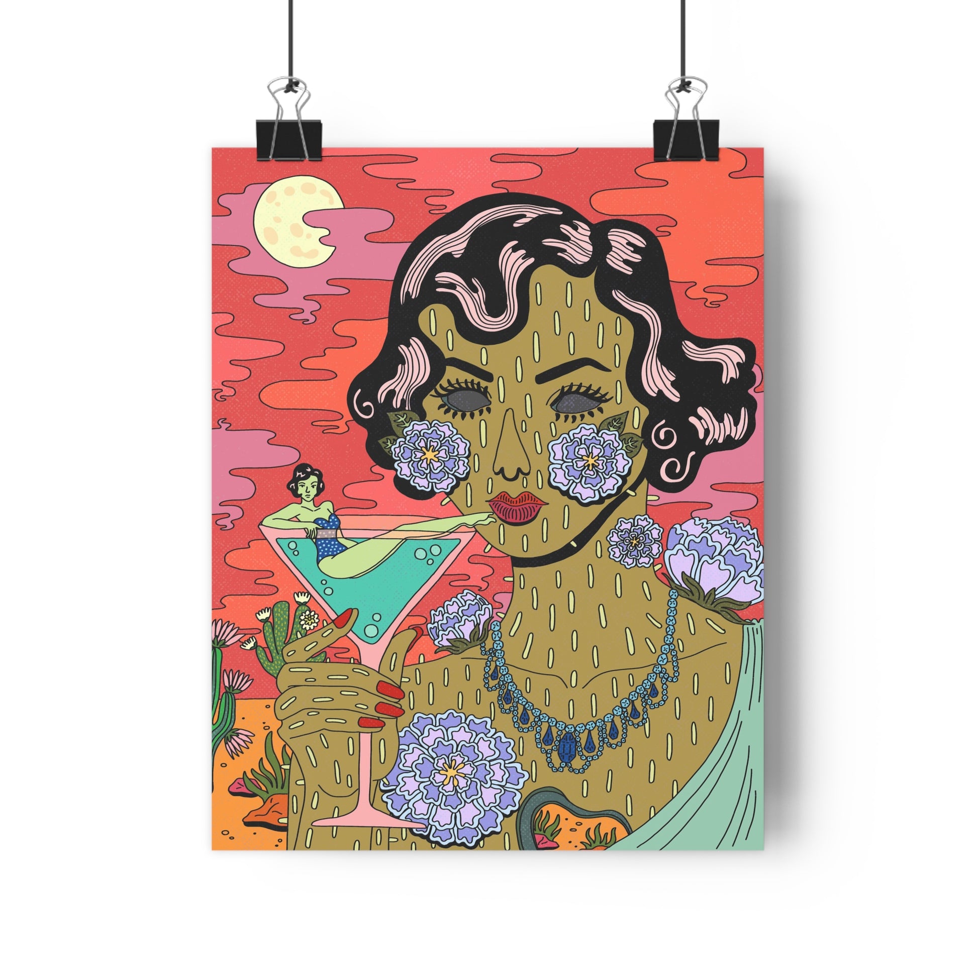 This giclée art print brings a vivid, surreal cocktail of color and emotion to any wall. A retro‑styled woman holds a bright martini beneath a coral sky and crescent moon, while sculptural blooms and jewel‑like accents create texture and depth. The matte, museum‑grade paper and pigmented archival inks keep those saturated reds, teals, and golds rich over time, so the scene stays as bold and intriguing as the day it arrived. Hang it in a cozy reading nook, above a bar cart, or in a studio to spark conversation and quiet wonder.
